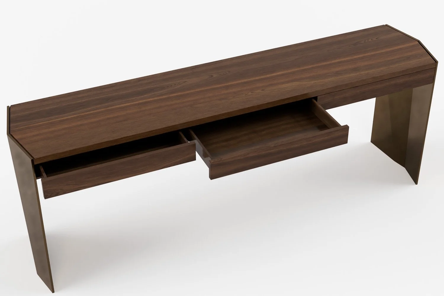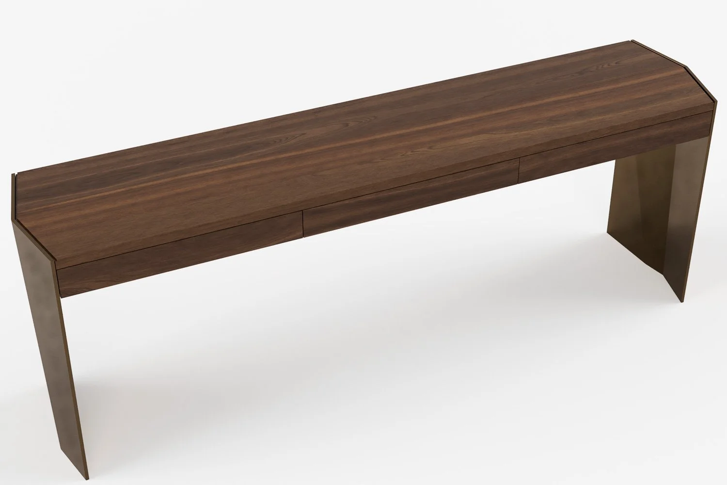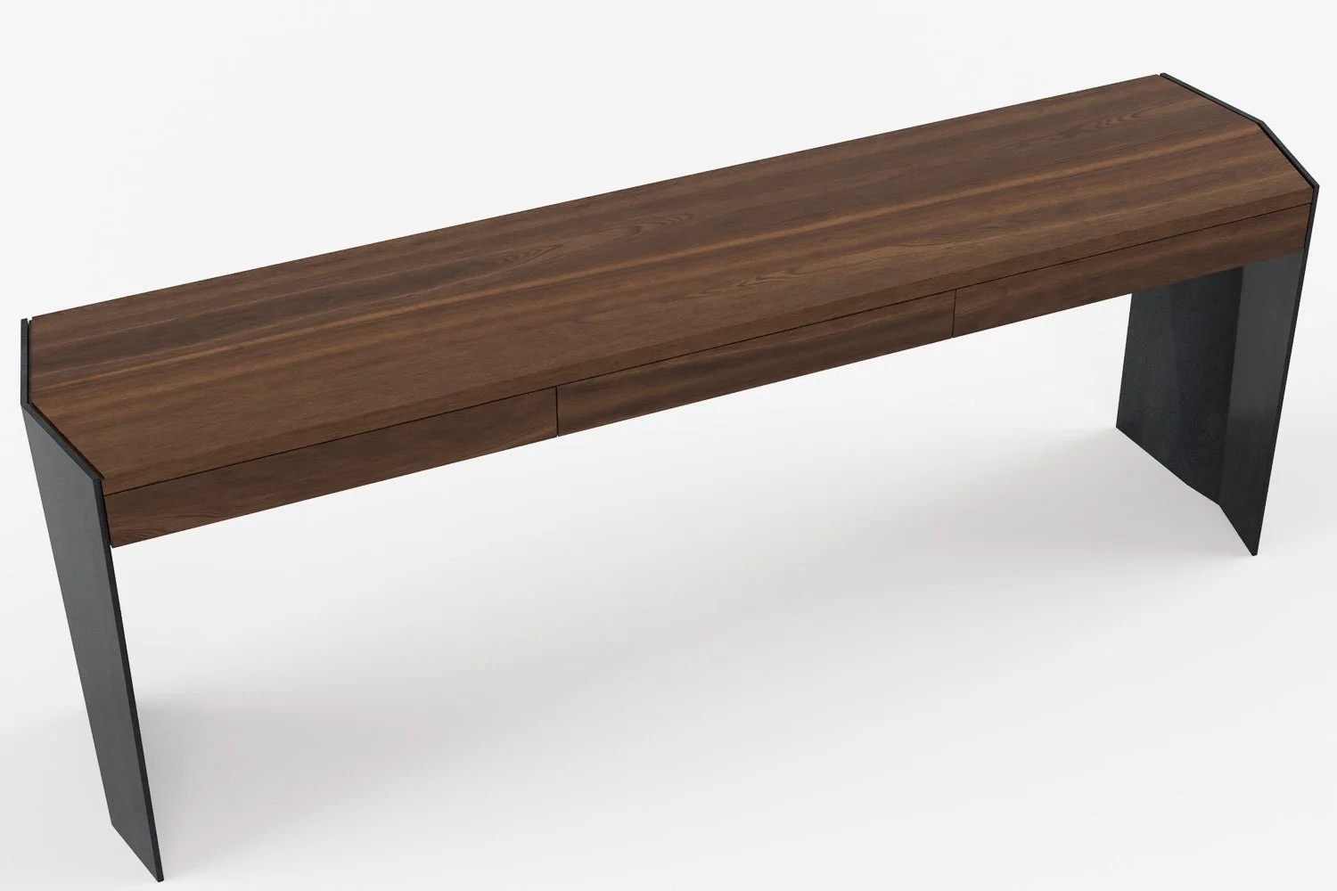 The Milford Console table is a refined piece with three soft-close drawers, shown here with an aged, blackened steel base or a burnished brass lacquer finish. A three-drawer statement piece, it balances refined utility with sculptural form. Crafted in river-rescued mātai and finished in a custom dark stain, it deepens the tone while bringing the grain to life.