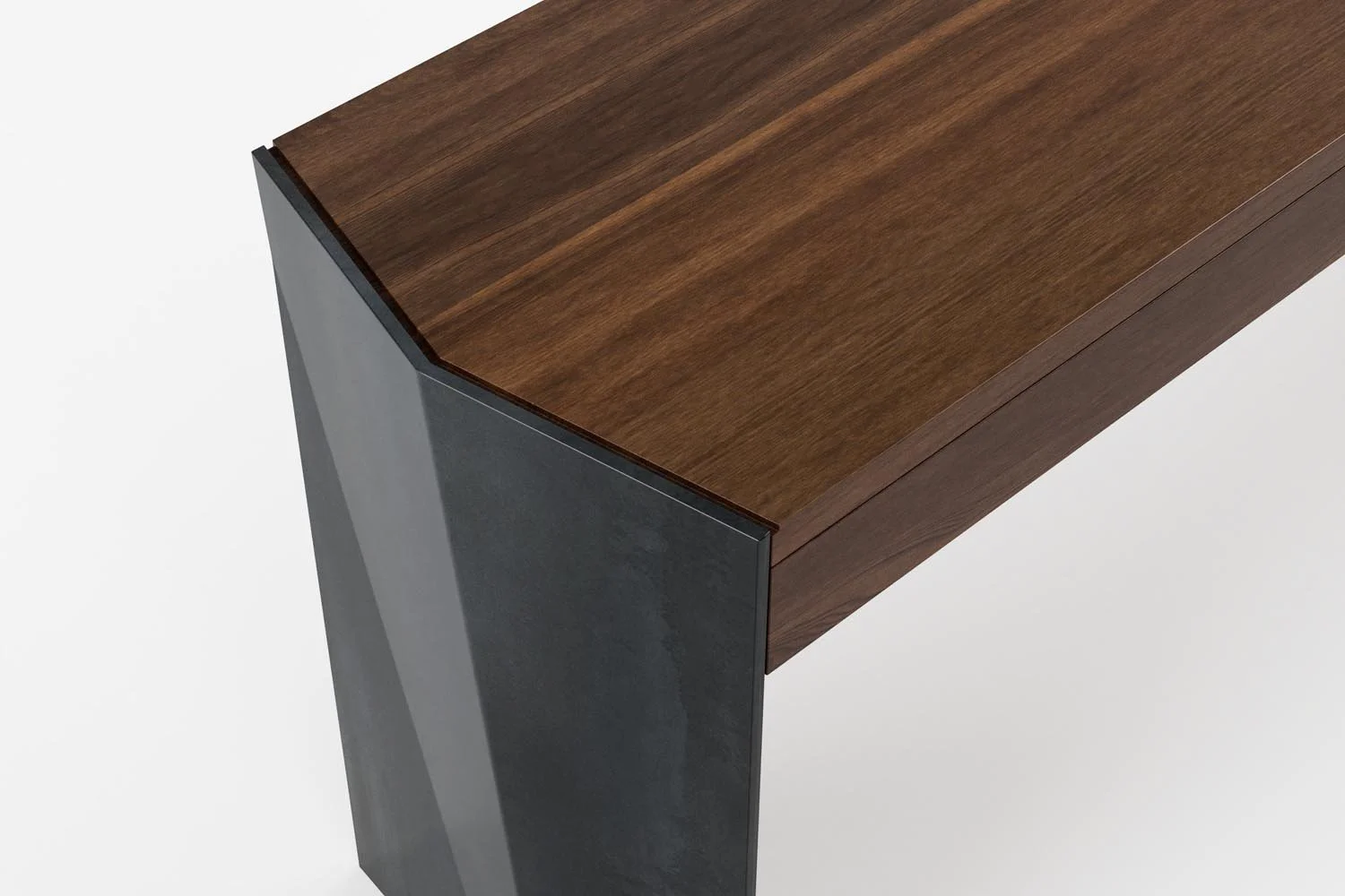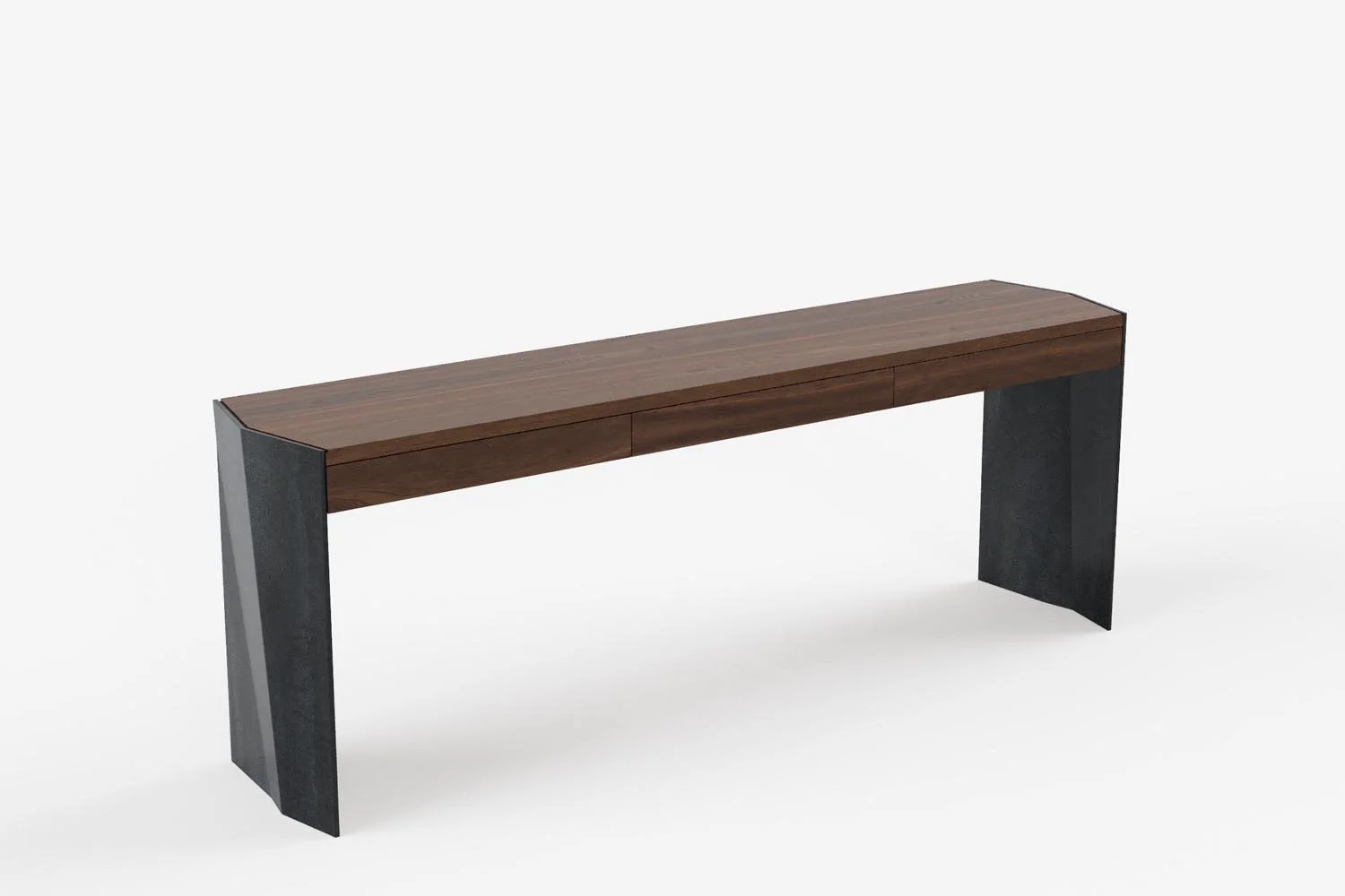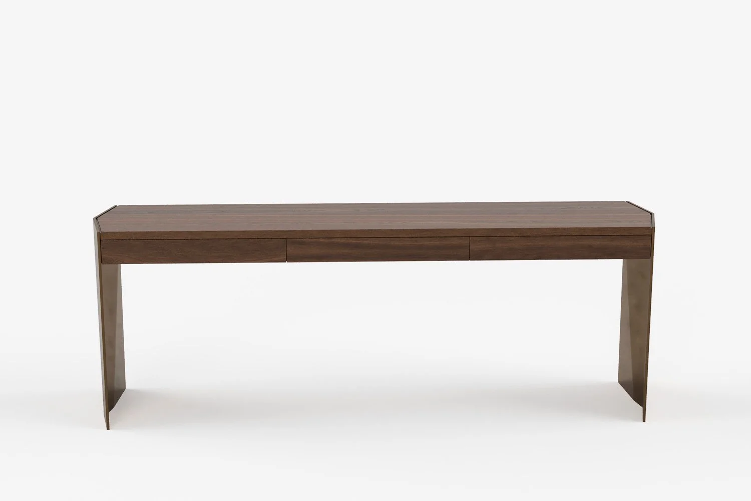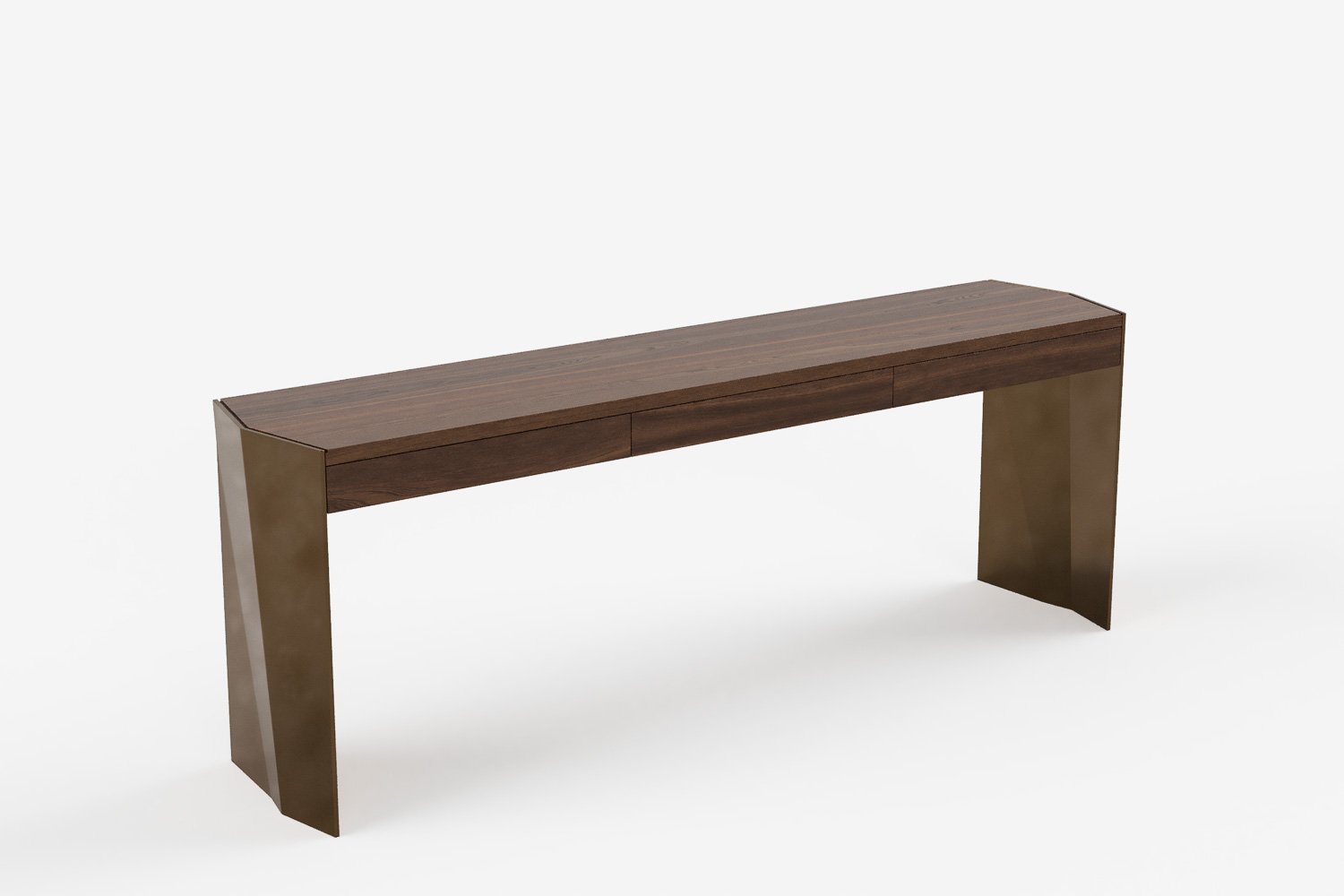 The Milford Console table is a refined piece with three soft-close drawers, shown here with an aged, blackened steel base or a burnished brass lacquer finish. A three-drawer statement piece, it balances refined utility with sculptural form. Crafted in river-rescued mātai and finished in a custom dark stain, it deepens the tone while bringing the grain to life.